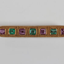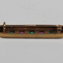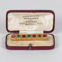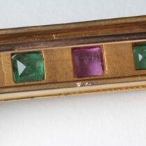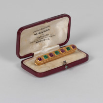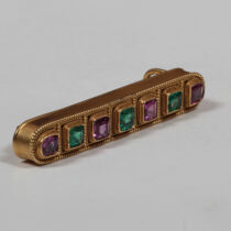 Etruscan Revival 18K gold brooch set with three square cut emeralds and four square cut rubies (approx. 7 carats TW), period box c. 1875