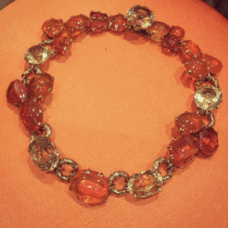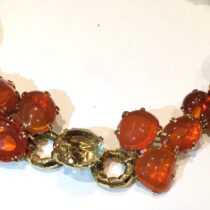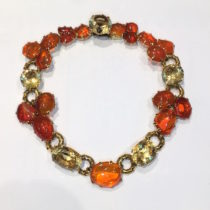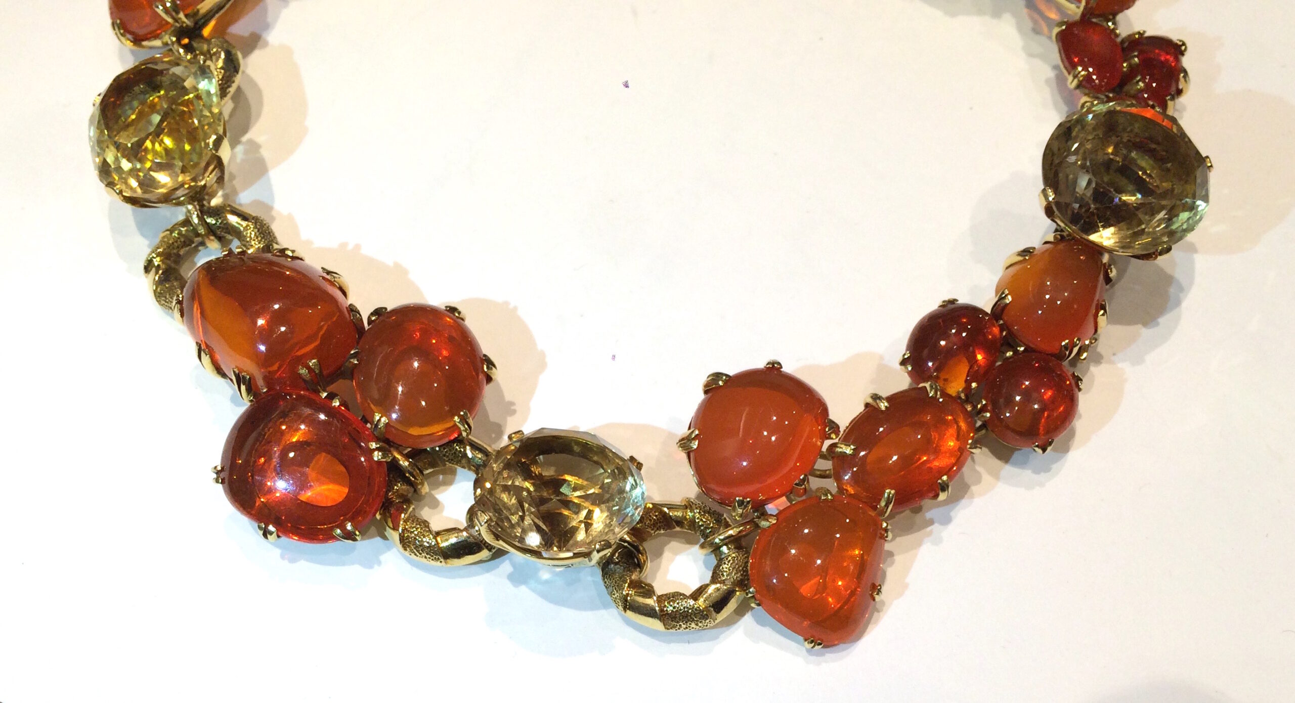 1940’s jeweled necklace, 18k gold textured ring links and elaborate bezel set 19 large cabochon fire opals (260 carats TW) and further set with two oval cut citrines and three round cut citrines (145 carats TW), c.1940
