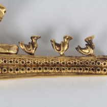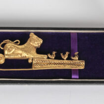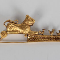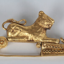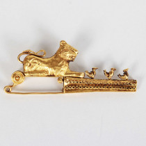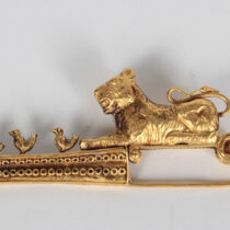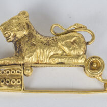 19th Century “Etruscan” 18K gold fibula brooch with a full figure lion and birds c. 1880