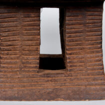 Hand carved wood with a rich, well worn and developed brown patina, minimalist decoration with fine line incising. Very comfortable chair.