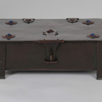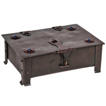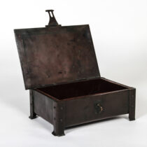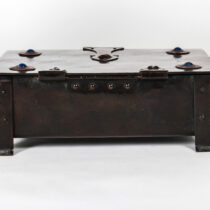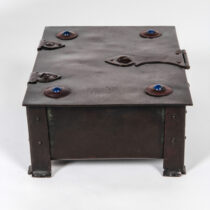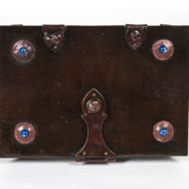 Hand wrought and patinated copper with riveted strap work and hasp, inset with 4 cabochons of lapis lazuli, brown leather and wood interior.
