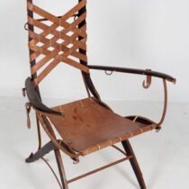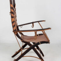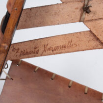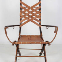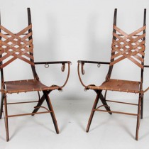 This pair of armchairs nods to the influence of such Italian designers as Carlo Bugatti and Carlo Mollino yet are their own unique creation. They have an unusual anthropomorphic quality in that the frame suggests a skeletal structure. In addition, the leather strapwork, iron loops and hooks allude to the equipage of the ancient Roman equestrian order.