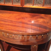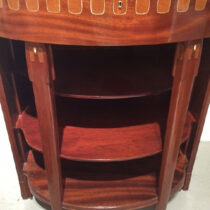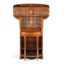 From the turn of the century through the early 1930s, Alfred Grenander provided the emerging metropolis of Berlin with an extensive net of subway stations. He was an architect, draughtsman, and city planner; as well as a remarkable furniture designer. Grenander was the celebrated German representative at the 1904 World’s Fair in St. Louis, where he was being honored as “the renewer of German art.” This mahogany cabinet inlaid with pewter, ebony and ivory was exhibited in the elegant Herrenzimmer of the German pavilion at the Louisiana Purchase Exposition, St. Louis, Missouri, 1904, was bought in 1904 by a Kansas City, Missouri family and the piece descended in the family.