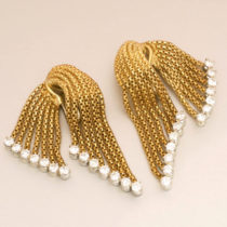 American 1940’s yellow gold drape earrings, square link chains set with 28 round diamonds (approx. 7 carats TW), c. 1948