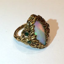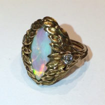 American Arts & Craft “Stylized Leaf” ring, 18K gold set with two demantoid garnets, a diamond and a large marquee shaped cabochon fire opal, c. 1910