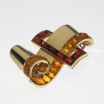 American “Retro” scroll brooch in 18K gold set with emerald cut golden yellow and madeira citrines, c. 1940
