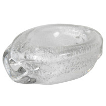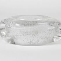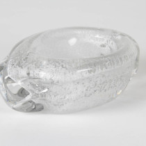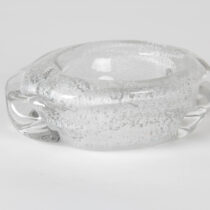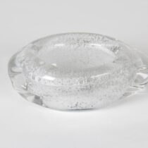Handblown and formed clear glass with bubble technique encapsulating a frosty white oxide.