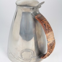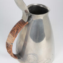 Pewter in swollen base form with abstract floral design in bas-relief; woven raffia arc handle (losses to central handle)