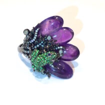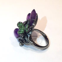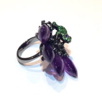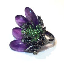 Asian Art Nouveau inspired “Frog on a Lily Pad” ring, 18K white gold with a gunmetal surface, cabochon amethyst petals, a three dimensional frogs pave set with tsavorites & sapphire eyes, diamond details, marked, c. 2005