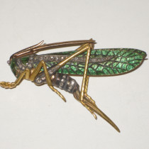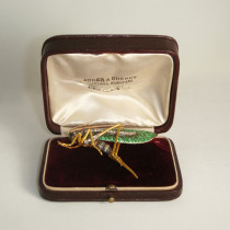 Auger & Gueret (Alphonse Auger et Antoine Gueret), Paris, “Grasshopper” brooch in finely detailed 18K gold, enamel and rose cut diamonds, original leather box, signed, c. 1895