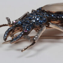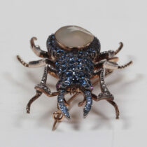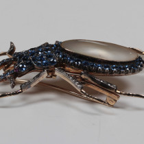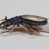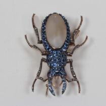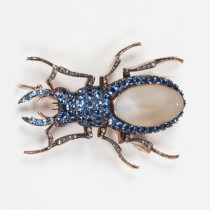 Belle Epoque “Staghorn Beetle” brooch, Montana sapphires set in white and yellow gold with a pearl back and 2 ruby eyes, c. 1900