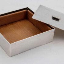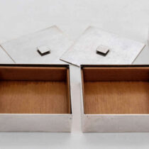Hand wrought and hand hammered silver with a wood lined interior, square shaped finial