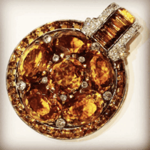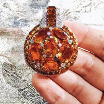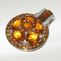 Cartier clip / brooch, 6 large oval orange citrines with buff cut citrines encircling the oval cluster, buff cut baguette citrines and diamonds set in platinum, signed Cartier, 0510, c. 1930