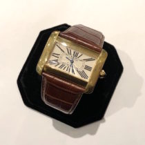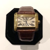 Cartier “Divan” full size watch, 18K gold sapphire bezel, original Cartier crocodile band with matching Cartier 18K gold buckle, signed, c. 2005