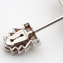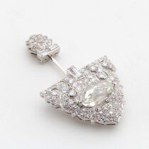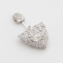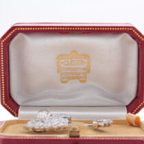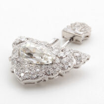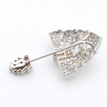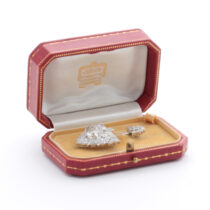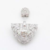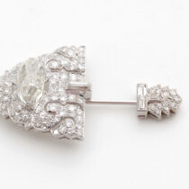 Cartier, Important jabot brooch, fan shaped with round and baguette shaped diamonds (Indian Royal Briolette diamond, 6.11 carats, G.I.A. certificate) set in platinum, original leather box, signed, c. 1925