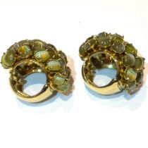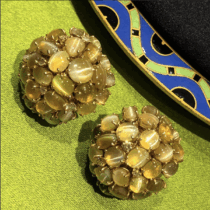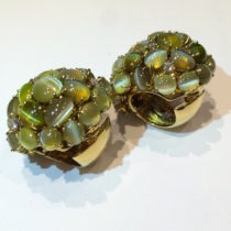 “Cat’s Eyes” bombe clip earrings, 72 fine and rare color cabochon chrysoberyl “Cat’s Eyes” and 12 interspersed diamonds, all set in 18k gold, marked, c. 1950’s