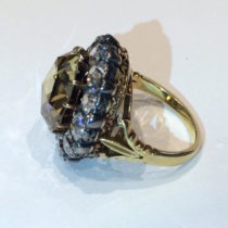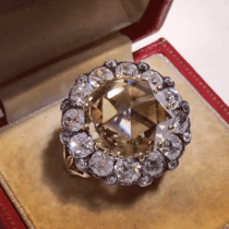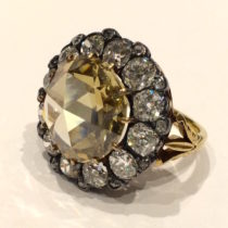 Champagne “Mughal” Diamond ring, Round rose cut fancy light to fancy brownish yellow natural color center diamond encircled with 12 old mine cut brilliant diamonds and 12 small round diamonds; mid 19th Century