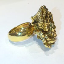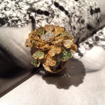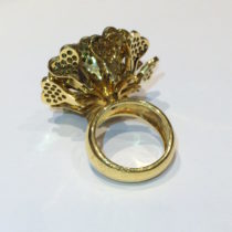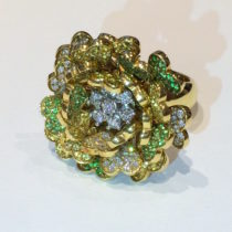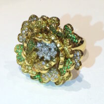 Chanel, Paris “Camellia” 18k yellow gold articulated blossom ring, 75 round full-cut white diamonds, 101 round full-cut yellow diamonds, 94 round full-cut demantoid garnets all in 24 flower petals, signed, c. 1980’s