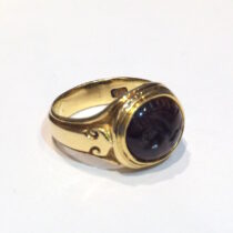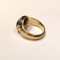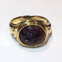 Charles Gordon “Medieval Revival” signet ring, 18K gold with stylized arrow motifs on either side and bezel set with an ancient agate Intaglio carved with the head of a knight, Latin or Greek letters, signed, c.1850