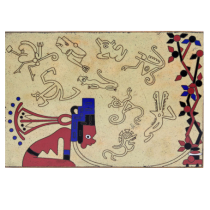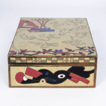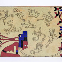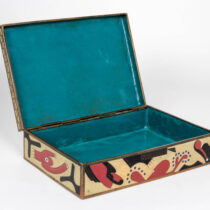 Cloisonne enamel in a fantasy of archaic Chinese motifs in red, royal blue, black white and sand colored abstract designs on a bronze body with a turquoise enameled underside and interior.