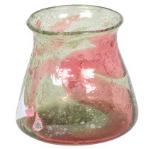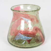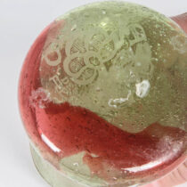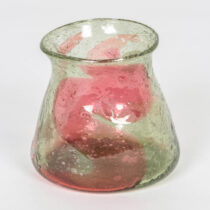 Blown glass with a strawberry red and green swirl design and internal bubbles