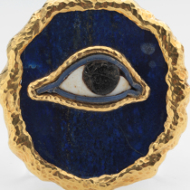 David Webb, Important “Eye of Horus” brooch, ancient Egyptian eye relic, lapis set in 18K gold, signed, c. 1960’s