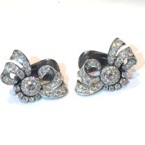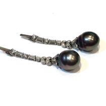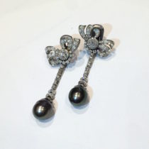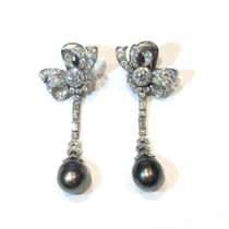 American “Night & Day” pendant earrings, two black pearls suspended from detachable pendants with a bow motif, all set in platinum with approx. 134 round diamonds and four baguette diamonds (approx. 8 carats TW), c. 1935