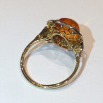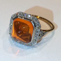 Edwardian Sugarloaf Fire Opal (approx. 4 carats TW) ring with 32 diamonds set in a milligrain platinum topped 18K yellow gold mounting, marked, c. 1910