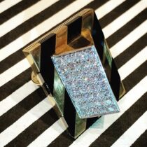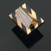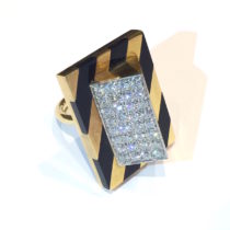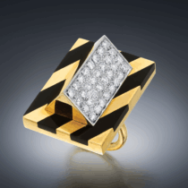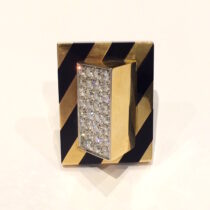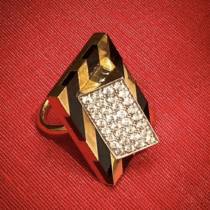 Ettore Sottsass / Cleto Munari Diagonal stripe and pyramid ring, 18K gold architectural with inset onyx stripes on a diagonal, inset with approx. 8 carats TW of pave diamonds, signed, c. 1985