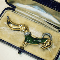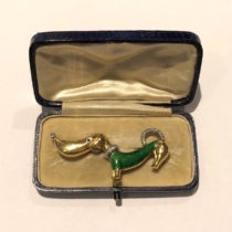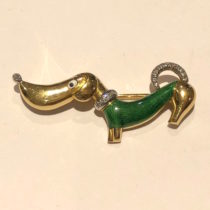 European Art Deco whimsical “Dachshund” brooch in 18k gold, green champlevé enamel sweater and eye and set with 18 round-cut diamonds, signed, c. 1930’s