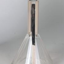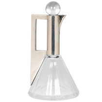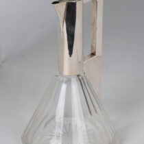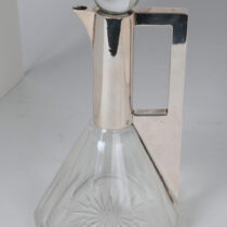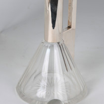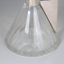 Silver mount with a rectangular handle cut out on a cut paneled crystal body, round crystal silver mounted stopper.
