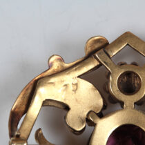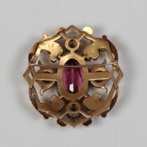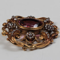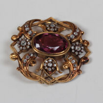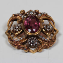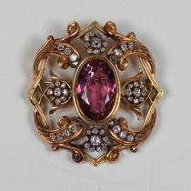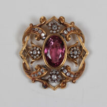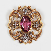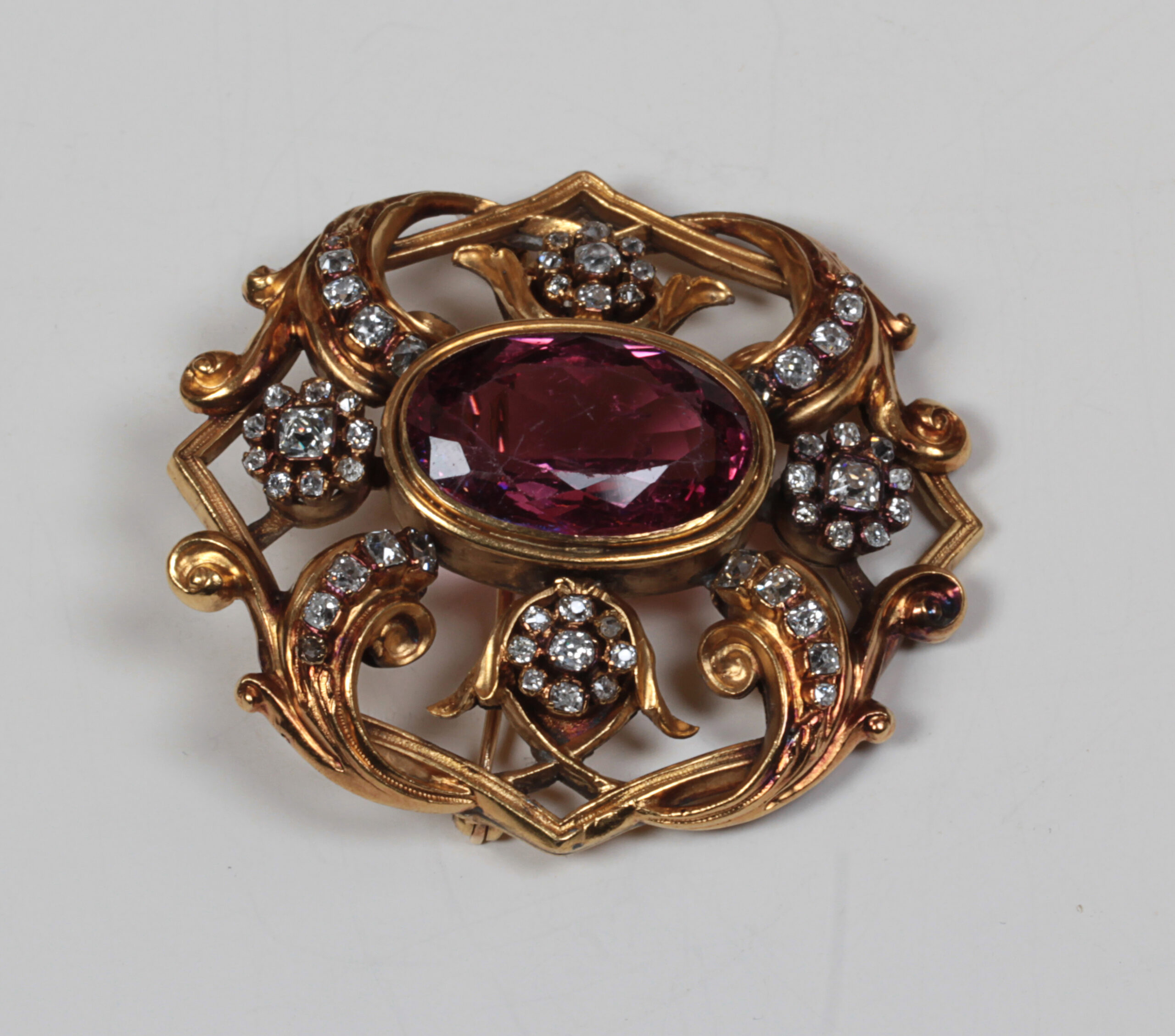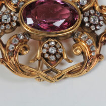French 19th Century “Baroque” inspired brooch 18K yellow gold set with a large oval cut pink tourmaline (approx. 16 carats TW) and 59 rose cut diamonds (approx. 5 carats TW), marked, c. 1890