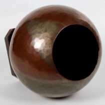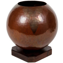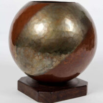 Richly patinated handwrought boule vase with a double large triangle silver overlay motif, square palm wood attached base