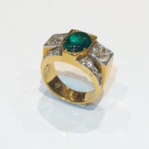 French Art Deco Emerald ring set with a very fine cabochon emerald (approx. 3 carats TW) & two old European cushion cut diamonds (3 carats TW) & further set with 12 round cut diamonds all set in 18K gold, signed, c.1920s