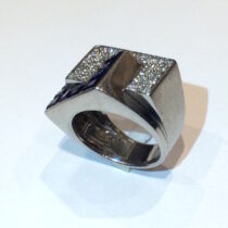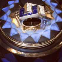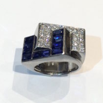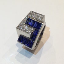 French Art Deco Interlocking ring, Invisibly set rectangular sapphires (10 count, approx. 2.50 carats TW), pave diamonds (approx. 2.50 carats TW) all set in a platinum mount, c. 1935