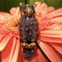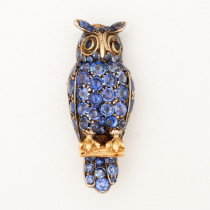 French Art Nouveau “Owl” brooch, Montana sapphires (approx. 7 carats TW) set in 18K gold, marks, c. 1900