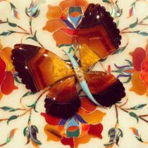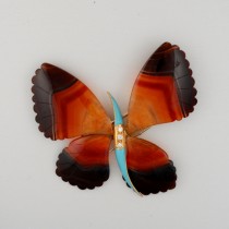 French butterfly brooch with banded carnelian agate, blue enamel and diamonds set in 18K gold, marks, c. 1950’s