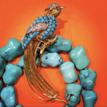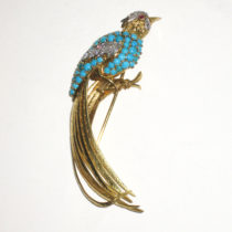 French “Exotic Bird” brooch, 18K gold set with diamonds, cabochon turquoise and a ruby eye, marked, c. 1940