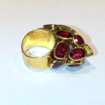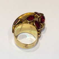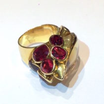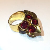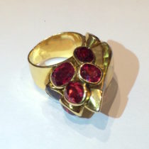 French Indian inspired gem cluster ring, 18K gold set with an exotic carved citrine and eight oval cut rubellites, signed, c. 1930’s