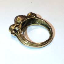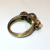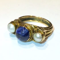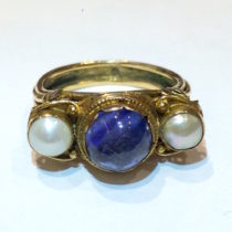 George Hunt (1892-1960) “Arts & Crafts” ring, Hand wrought gold set with a cabochon sapphire (approx. 1 1/2 carats) and two pearls, signed, c. 1920