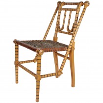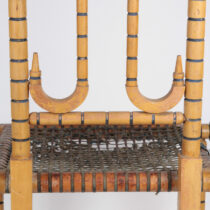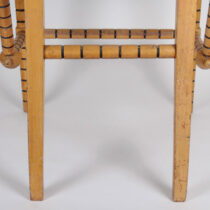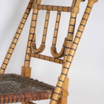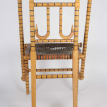 George Hunzinger emigrated in the 1850s from the Black Forest region of Germany where his family had worked as cabinetmakers since the 17th century. Settling in New York, he joined a community of 3,000 German furniture makers but soon distinguished himself as a maker of patent furniture and “fancy chairs”. Hunzinger’s innovative designs are often associated with the development of the Aesthetic Movement in America. By the 1870s, his chairs were sought after by many Americans as accent pieces for their parlors. The woven mesh or upholstery of these innovative chairs follows the original intention of the maker and the turned frame has an avant-garde, colorful and rather contemporary feeling painted in a combination of a rich ochre yellow and cobalt blue, a color combo that was highly prized for it’s eccentricity in Victorian America.