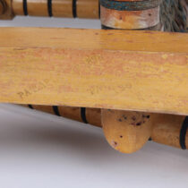 Yellow and blue painted elaborately turned wood, blue thread woven covered metal band mesh seat (original condition)