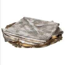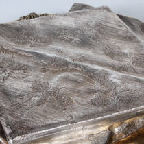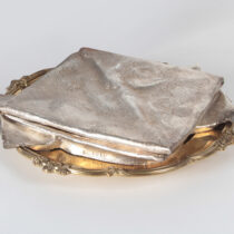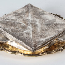 Sterling silver shallow box with a hinged lid of a life-size trompe l’oeil damask napkin neatly folded on a gilt-sterling Georgian dinner plate