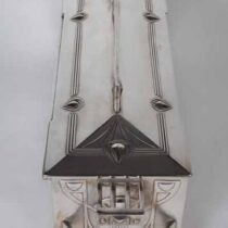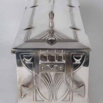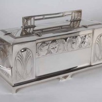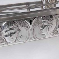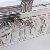 Silver plate with Jugendstil design buttress handles and open work handle with a frieze of Art Nouveau maidens representing the four seasons, velvet lined with two original keys.