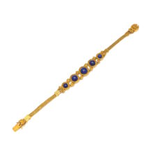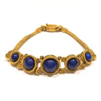 Giacinto Melillo (attr.) Etruscan/ Egyptian Revival bracelet, 18K gold braclelet set with delicate floral rosettes, fine wire work, gold granulation further set with 5 round cabochons of gem quality lapis lazuli, c.1875
