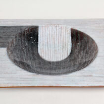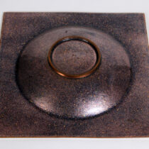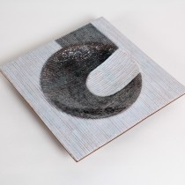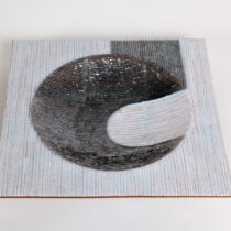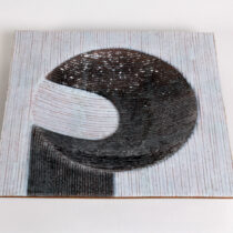 Silver foil enameling on copper with a striated silvery white body with a dark silver grey modernist graphic.