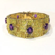 H. Stern, Rio de Janeiro, Brazil highly textured and sculptural tapered bracelet in 18K gold set with 7 oval gem quality amethysts (approx. 14 carats TW), signed, c. 1960’s