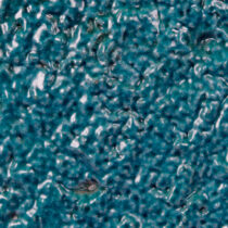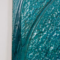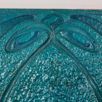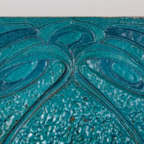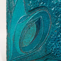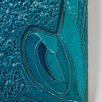 Fired and glazed lava with abstract whiplash motifs in various tones of aqua blue on the obverse and a partial graphic on the reverse with polychrome floral and linear details.