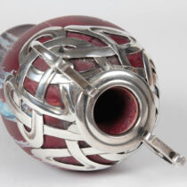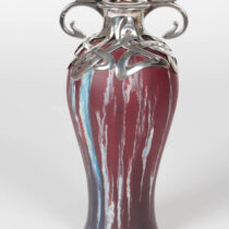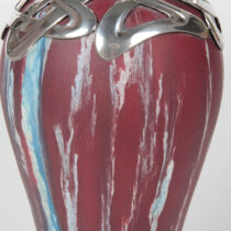 Matte-glazed pottery, cranberry bright turquoise and white highlights, elaborate Art Nouveau whiplash silver mount.