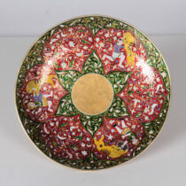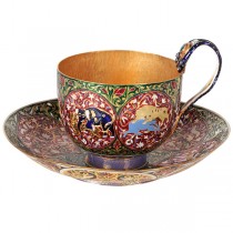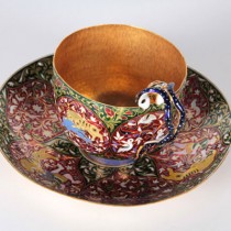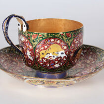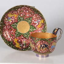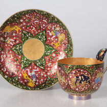 High carat yellow gold (22-24 carat) cup and saucer set with a fine emerald, ruby and diamonds, the cup with a high foot with rounded sides and handle formed of two snakes intersecting at three points and biting the rim. The exterior is decorated with red, green, blue and white enamels with roundels containing combatant animals on a ground of floral sprays, the saucer with gently rounded sides decorated with lobed cartouches containing warriors combating tigers and birds, the underside with a series of oval panels containing peacocks and hummingbirds.